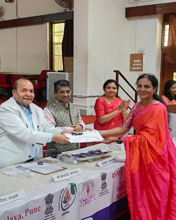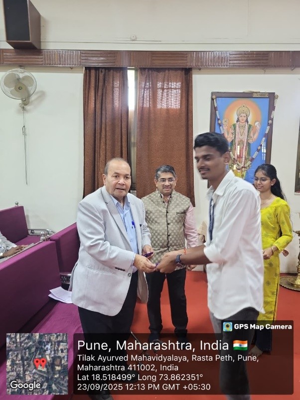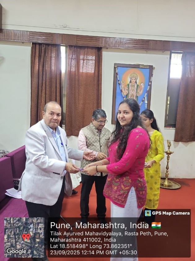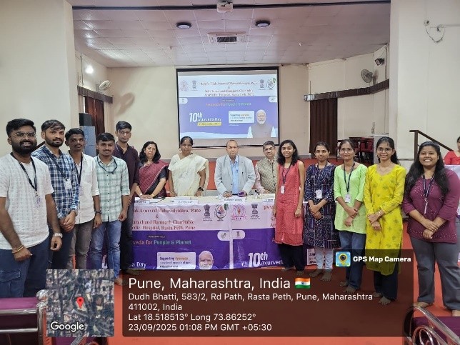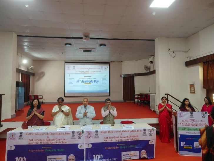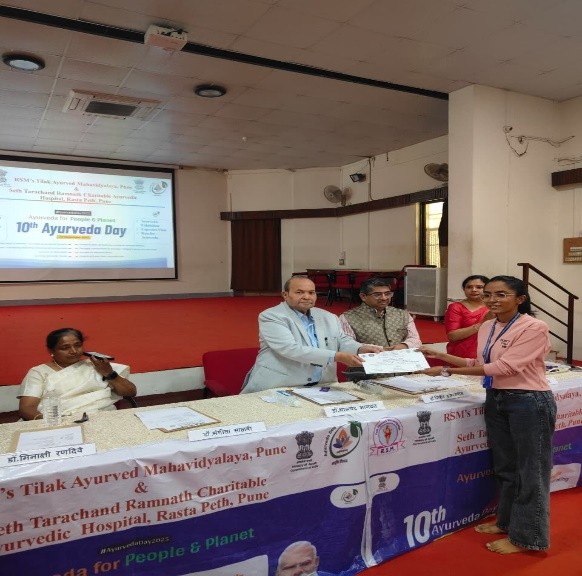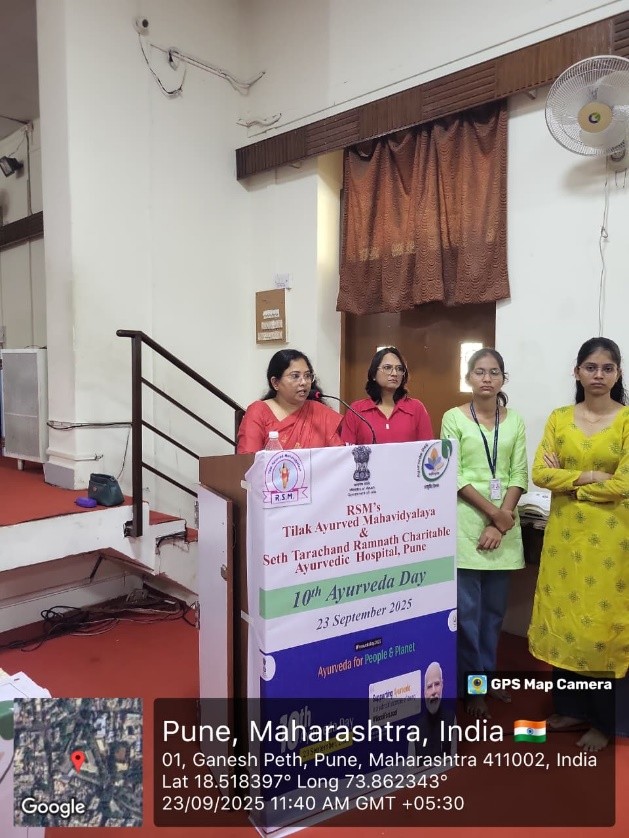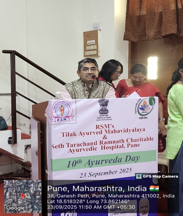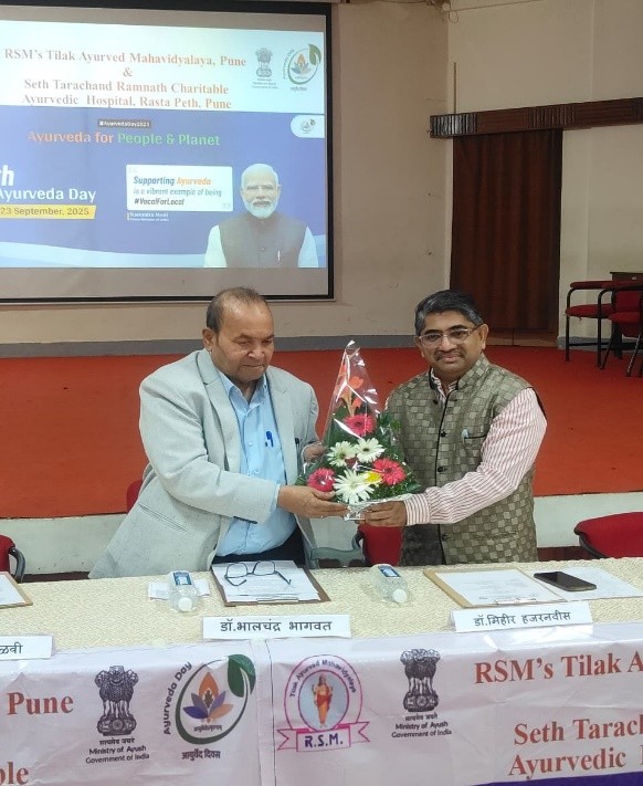 As per the notification of NCISM, New Delhi Tilak Ayurved Mahavidyalaya celebrated the 10th Ayurveda Day on 23.9.2025. The 10th Ayurved Day activities were conducted on the main theme “Ayurved for People and Planet” and 8 sub themes as declared by NCISM, ministry of AYUSH. Dr. Bhalachandra Bhagwat, President, Rashtriya Shikshan Mandal, Pune chaired the programme. Dr. Mihir Hajarnavis, UG Vice principal, Dr. Minakshi Randive, UG Vice principal and Dr. Sangeeta Salvi, PG Vice principal were also present as guest for the programme. Dr. Aishwarya Ranade, Nodal officer for 10th Ayurveda Day activities compeered the whole programme. All HODs, Teachers, UG and PG students and the non-teaching staff were present on this occasion. Dr. Mihir Hajarnavis introduced various activities conducted to propagate Ayurveda on the given themes. Dr. Sangeeta Salvi introduced the gathering about the guest present for the programme. Dr. Aishwarya Ranade presented a complete report various activity conducted by Tilak Ayurved Mahavidyalaya and Seth Tarachand Ramnath Charitable Ayurvedic Hospital.